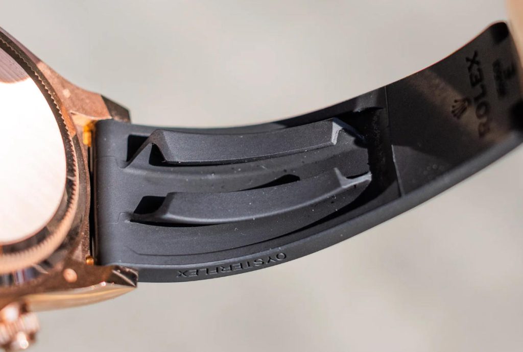 Swiss movement clone Rolex watches first venture beyond metal or leather arrived at Baselworld 2015 in the form of the Everose Yacht Master 40 mm ref. 116655. At a glance, Oysterflex looked like any high-quality rubber strap, but underneath the matte elastomer lurked two curved titanium nickel blades moulded into the structure. The result was a rare polymer strap that flexed yet refused to stretch; paired with soft longitudinal “wing” cushions, it remained centred on the wrist and resisted the degradation that plagues natural rubber.
